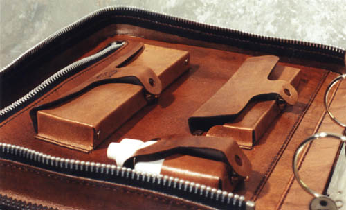 ![]() Other Pics of this piece: Trigger Snap and Handle Detail Tooling and Buckle Detail Zipper End Detail Exterior of open Case Interior of open Case Pockets on inside front Detail of Pockets, unfastened Handle Detail |