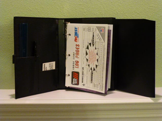 Trucker's Log Book CoverThis trucker's log book differs from the previous one in that it is a cover for a binder. Rather than a pad that slips into the cover, this log book was for loose leaf pages held together in a 3 ring binder. Instead of riveting a binder into the cover, which would require additional work to replace when it fails from use in a few years, this cover was made more like a book cover. An inexpensive log book binder is slipped into both sides of the cover. One side has pockets for a ruler, a pen, and some business cards. The other side allows the fold-over writing surface to go through so that it can still be used to provide a hard surface to write on, as well as protecting the other pages within the binder. The cover is held closed by 3 pen loops through which a single pen will keep the cover closed and the contents safe.The artwork on this cover was based off of two photographs. An appropriate type of truck was found online in the desired point of view. That was traced for the carving. The actual owner's truck was used as a reference for the coloring and some minor changes to the traced photo as needed. Careful application of black dye followed by black stain resulted in a deep, pitch black background with accents to the tooling to enhance the depth and give an aged appearance. This cover was made 100% from scratch, not a kit, made to precisely fit the log book binder. It is hand stitched with black waxed thread, and the edges are smoothed and finished with a black edge coat. Finally, a clear gloss lacquer finish provides heavy protection from life and the elements while giving it a shine that will last for years to come. Price: $150+ |