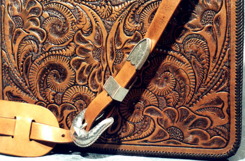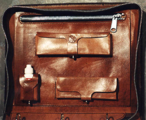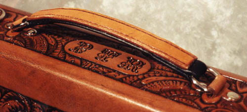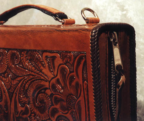 ![]() Other Pics of this piece: Trigger Snap and Handle Detail Tooling and Buckle Detail Zipper End Detail Exterior of open Case Interior of open Case Pockets on inside front Detail of Pockets, unfastened Handle Detail |