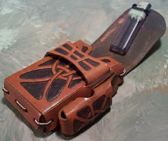 Cigarrette CaseSimilar in construction to the other case, this one sports an original design by me inspired by the Leather Art of Joe Barth. Also long enough to hold exta-long cigarrettes, and flexible enough to slap against your palm, this case will never let you down. With the lighter caddy.Price: $40+ |