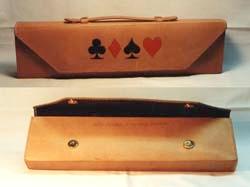 Cribbage Board CaseThis case is large enough to hold a standard (store-bought) cribbage board, and a deck or two of cards, along with any other small items (pencil, notepad, etc..). The handle is a "sliding" handle so that it can be carried, and lay flat for easy storage. The cover flap is held shut with two magnetic clasps, and the case is lined. It is hard to see, but just under the flap is the cribbage phrase, "His knobs is in my hand!" (cribbage players will know. ;-)Price: $150+ |