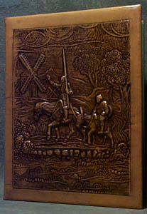 This is an example of the modern Cordoban leather style. I purchased this notepad book while at the 1999 Encuentros in Spain. There I learned about all sorts of different artists and styles, not the least of which was the Cordoban style. In a nutshell, it's embossing. They use a different technique, though, using modeling clay on a board, and forming the leather *over* the clay, rather than using a ball stylus to emboss the leather from behind as in other techniques. After the leather is embossed, the back is painted with glue so that the leather retains the embossing best. |