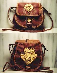 I found this purse at the Portland Saturday market one summer. Unfortunately, I forgot to grab the artists card, and his name is long gone from my feeble memory. I can tell you he was Native American, and very talented. If you recognize this artists work, please contact me. Aside from that, all I can tell you is that this piece is totally hand made from different colors of deerskin and/or a thin chrome tanned leather with an inlayed piece of "scrunched" deerskin on the front and cover flap. It's totally hand stitched with natural colored artificial sinew, and hand braided sueded leather strap which is attached with wrapped black deerskin and beads. It's hard to see all the work that went in this peice just from the photo, but I can guarantee that it is very impressive. I just wish I could track down the artists name to properly credit him. |