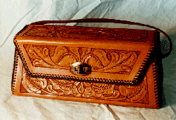 Custom HandbagThe purse you see here is actually by another crafter. It has one large compartment and two pockets, one on either side. It has only the natural leather color, but very detailed tooling over all surfaces. The interior is lined with Ostrich leather and is quite beautiful.Price: $300+ |