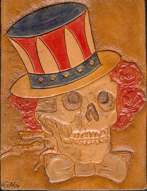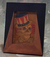 Grateful DeadI apologize profusely to any Dead Heads that know the name of this image. I did this as practice for a wallet for a freind of mine, but have forgotten the name of this particular image. Anyway, here it is, in all it's glory. The actual size is about 3" by 4" and the frame adds a couple inches to each dimension. The frame can be set on a desk or hung on a wall.Price: $40+(includes frame) |