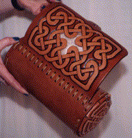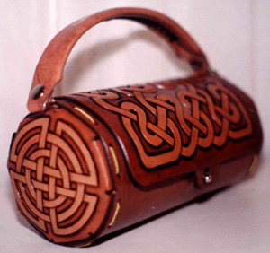 "Sheba" HandbagThe "Sheba" is a concept I'm still working on as I have time to develop it. It's called the "Sheba" because I gave this prototype to my sister, who uses "Sheba" as a nickname on occasion. I'm still working on improving and redesigning it. I would ask that you do not attempt to copy it, but I certainly can't stop you. I got the idea for this from an artist that makes cylindrical purses out of license plates. I had never seen anything like it in leather, and so set out to design something. This is only a prelimenary design. I have tons of improvements floating around in my head, but not enough time/materials/skills to do some of them. So, it will have to wait until I acquire the skills needed to bring my ideas to life, as well as the $$ to pay for materials for a project that might turn out as crap. :\Price: $100+ |