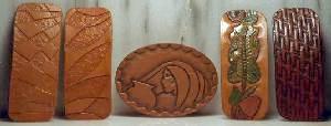 hese hair barrettes have a spring clip on the back and are carved from heavy leather.