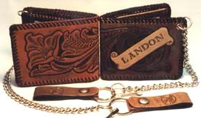 Top-Notch BillfoldsSimilar to the Top-Notch billfold with the f/X logo, these two have the same interior of two card pockets on both sides, and one large bill pocket. The differences are that these are assembled using the double-loop leather lacing, chains were added for security, and a common western floral pattern with name banner was done.Price: $50+ |