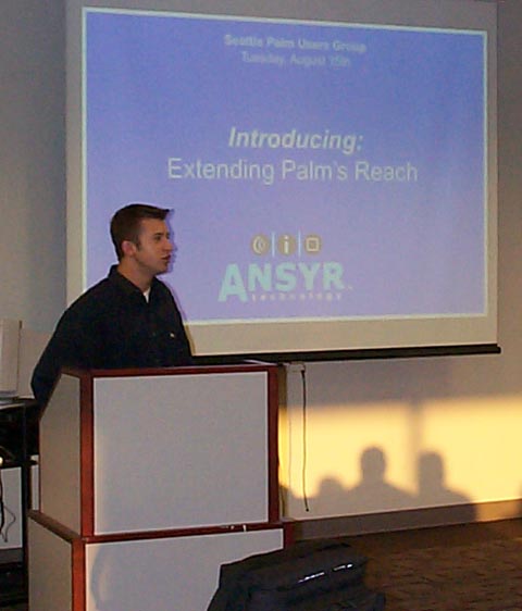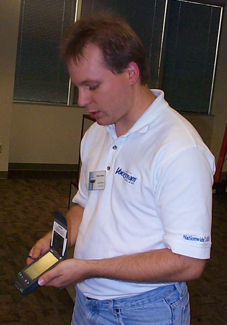 Bill Hagsten and his team from Ansyr (pronounced "answer") gave a great presentation on their PDF viewer/converter for the PalmOS that is "pre-Beta." Essentially, there is a desktop application that converts PDF files into images that are compressed for viewing on the Palm with their viewer. The desktop software allows for page selection, zoom settings, and other "tweaking" to conserve file size on the palm, while retaining readability. Although the conversion software for the desktop is not free, the viewer will be free, allowing people to share the viewer and their documents without licensing worries (other than any involved with the document) for consumer use. For people who need on-the-road access to information/images currently contained only in PDF files, this will be invaluable. They showed us how their software can take a complete PDF document, preview the image before conversion, and convert all the pages, or those selected, into a format viewable on the Palm device.