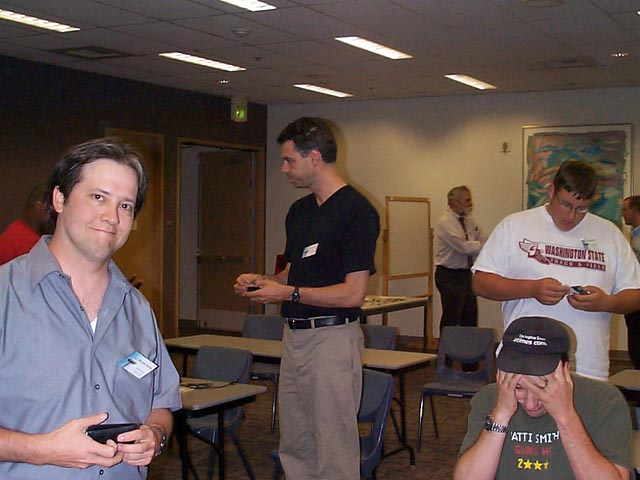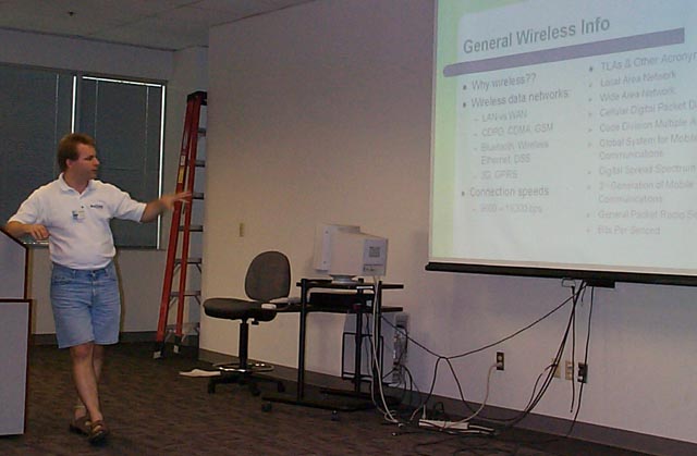and a PalmIIIc connected to a wireless phone via a cable. He gave a quick demonstration of the PalmIII with Minstrel-III, but was hampered without a way to make it easy for the entire group to see the demo.