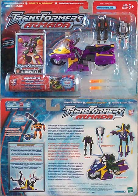 | Added by: Logan Cracraft on January 14, 2003 Rated it: Comments: One of the best DECEPTICONS in the Armada line, Sideways looks cool in bolth robot and vehicle modes(this coming from a guy who will only ride a Harley Davidson). The lack of knee articulation is sublamented with the ability to do very high high kicks. He can kick Optimus in the faceplate. The headmaster minicon is the best minicon gimmic yet, however the legs on the minicons look really silly. if you bend the legs behind the minicon, however, the look isn't that bad. I like most people see Sideways as a Decepticon, the purple color to the over all kick butt look to the toy only work in that favor. I say buy him, slap a Decepticon symbol on him and have him join the league of Megatron. |