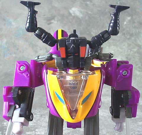 | Added by: james aka legend on January 05, 2003 Rated it: Comments: Wgat a gimmick l;oaded trasformer although i must say i would prefer it if he were just a decpticon instead of these stupid mini-con-head-thingys that dont even transform into a vechile...otherwise all good except he has no knee articulation :( |