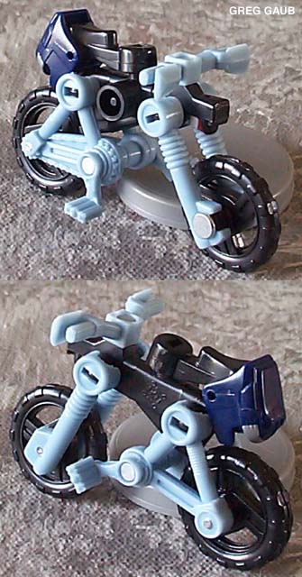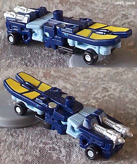 Toy Review: Quirky. That's what these guys are. Their cartoon depictions aside, I like them. Grindor has a great robot mode, even if a "rocket powered skateboard" is a little off the wall. I had a moped when I was in college, so I really like SureShock, even though his robot mode is just plain lame. High Wire is the homeliest of the bunch. His bike mode looks OK, but his robot mode is just pathetic. As little more than the head for Perceptor, the combined form of these three Minicons, he might as well not exist. I like a robot with wheels on his shoulders as much as the next guy, but I think without High Wire and an extra head on Grindor somewhere, Perceptor would have been just as good. Now that I've mentioned Perceptor, he's not a bad robot. He looks as cool as Grindor does, and by virtue much cooler than High Wire and SureShock. He's not real posable or anything, as parts of him get in the way of other parts. Honestly, the only reason to get this set is for Grindor, and because it's a combiner. Perceptor in the show kick tailpipe, so it's neat to have this character in toy form. I like it, so I recommend it.