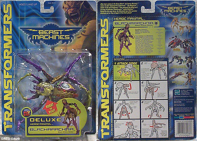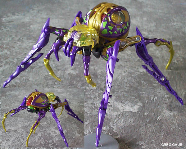 - Probably the better of her two modes, she has barbie-like qualities. Her long legs are twice the length of her torso. Her waist is about the size of her neck, and she has breasts, as all well designed female toys should. ;-) I do have a couple complaints, though, starting with her hands... she has none. Well, she has long claw-like things that serve as legs in beast mode. As spider legs they work, but not as robot arms. They should have made the ends of the legs fold back to reveal small hands or something. Also, the range of movement in her legs leaves something to be desired. Due to their design of separating into two spider legs each, some joints had to be simplified, or left out entirely. Her legs do not rotate anywhere. Simply, her knees hinge, her ankles hinge, and her hips are on limited ball and socket joints. As a result, her legs don't leave much room for posing position, as doing anything other than standing straight causes her to lean to one side, and her waist only spins so you can't straighten her up. On top of all that, she's got a big 'ol butt, made from her spider abdomen.