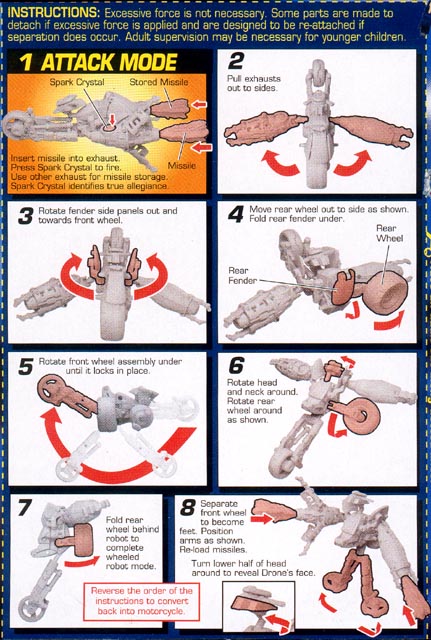 - If you look at the tech spec, you'll notice that it looks different that my pics. That's because the idiot who photographed the toy didn't transform it right. It's so completely mis-transformed that I'm not going to list all the ways it's wrong. It's just plain wrong. As I said earlier, the instructions are very good. As long as you don't look at the screwed up pic on the package, and follow the instructions exclusively, you'll have a nice looking toy.