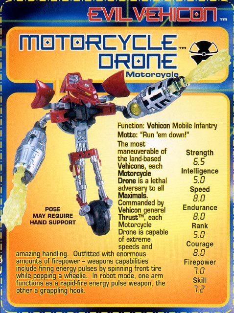 - He looks almost exactly like the show in his unicycle robot mode. His wheel can split much like the deluxe Thrust toy, which makes him able to stand on his own, but his legs are articulated, so posing is nigh impossible. Even though he has to be held to stand in robot mode (with a wheel instead of feet), that simply makes for show accurate play value. It's a lot more fun to zoom him around on a wheel than it is to make him waddle on his feet. His robot head is a dead ringer for the show as well. My main complaint is that his arms are too big. He's got serious Popeye syndrome, and the flaming projectile things only make it worse. In fact, with his projectiles inserted in the arms, he can use them as crutches in robot mode so that he can stand up.