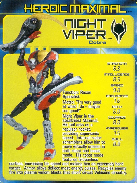 - Another "all powerful" spec. He's fast and hard to hit, but when a shot DOES get him, he deflects it or recycles it into a plasma blast and kills Vehicons?!? Come ON! Has he no weaknesses? With this guy, the Maximals would have won the next freaking DAY! Oy. Aside from his overblown tech spec, he's pretty cool overall. I'd be happier if they figured out way to make better use of those huge arm shields, if only to include bigger blades, and in both arms.