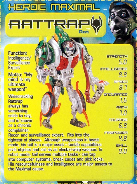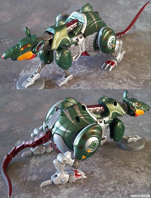 - I think it's a sufficiently complex transformation for a mega sized toy. His legs come out from inside the rat abdomen, and his rat head and front legs tuck into that cavity. The rest is flipping and folding. ;-) I think it's a very well designed transformation, aside from the robot head problem mentioned above.