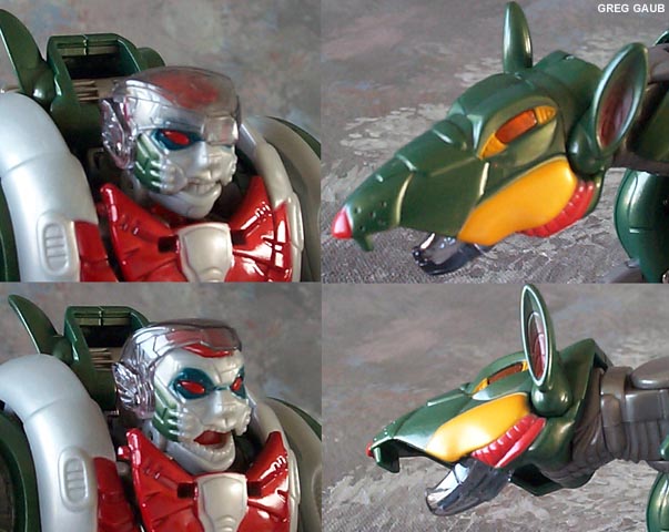 - Not exactly show-accurate. At least, not nearly as much as the beast mode is. His main downfall is his horrible hunchback. This is an unfortunate necessity for the accurate beast mode and hidden robot parts in beast mode, but can be difficult to overlook. In robot mode, he shows a lot more silver than in beast mode, and from the front is almost entirely silver, with some red accents. His legs are a little scrawny, especially compared to his arms (which are his beast mode's rear legs), but the huge blade things on each leg help with that. He appears to have a design flaw, though. His robot head doesn't like to be in a fully upright position when his chest is locked in. As a result, either he's looking slightly down, or his chest isn't locked together. This wouldn't be a big problem except that when his head is looking down, his chin is blocked by his chest piece, preventing proper functioning of his mouth gimmick.