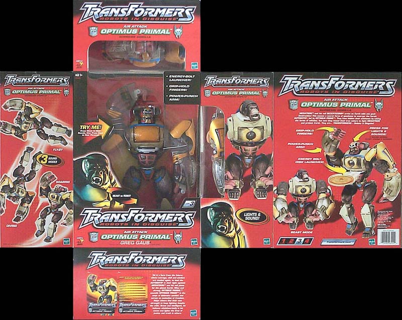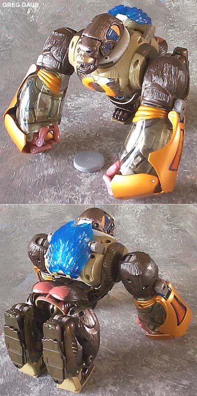 - Dark brown, gold, bronze, and orange with some pink and blue accents. Most unfortunate is their choice of coloring his monkey butt pink. Excuse me, but I don't think Silverback Gorillas have pink butts, especially not ones that look like a babboon's butt. Yes, it bothers me. Otherwise, I love his color scheme. It's easily one of the best Beast Machines color schemes. Oh yes, I forgot to mention that. THIS IS A BEAST MACHINES TOY!!! I know, they put it in RiD packaging because this toy was released long after the Beast Machines toy line and cartoon was over, but still... this bothers me as well. Such is life, let's move on...