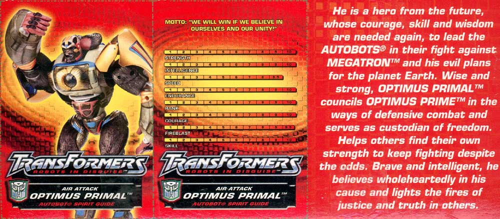 - He's electronic! Electronics include lights and sounds. The lights are pretty much only in his head/chest, but they flicker and strobe when he makes noises. To activate his sound effects, you press his chest panel, which makes a power up kind of noise. Then, when you press his head he says things. He has a few phrases total, one or two of which only play in beast or robot mode, including the infamous, "The seeds of the future lie buried in the past!" said with much fervor. Add to the cool (Garry Chalk's actual voice) speech sounds a really cool jet sound that is activated by the release of his jet pack. When you press the release switch, the jet pack pops down with the "blue flames" coming out of them, and the jet noise starts. What's really cool is that when he's vertical the jet sound increases in pitch, then if you aim him down as if he's diving, the sound decreases pitch, and if you have him sideways as if he's strafing something the sound plays a strafing kind of noise. I can imagine some kid flying AAOp all over his house with all those cool flying noises, pissing off his parents to no end. ;-) That's, of course, not all. He also has a disc launcher in his belly that makes an energy pulse kind of noise. And if you pull back his right arm and let go, it punches because it's spring loaded. Too bad the arm doesn't make a nice smacking/punching noise, though. hehe. All these noises cease to function after a set timeout has occurred. I'm not sure how long it is, but it's not very long, probably only about 20 or 30 seconds. That's plenty of time to play with the noises, but also short enough to not annoy parents with a toy that never shuts up, or wastes battery power (can you tell I'm a parent now? ;-).